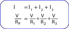 Arus total pada rangkaian paralel yang berasal dari sumber (baterai) terbagi menjadi tiga cabang. Arus yang keluar dimisalkan I1, I2, dan I3 berturut-turut sebagai arus yang melalui resistor R1, R2, dan R3. Oleh karena muatan kekal, arus yang masuk ke dalam titik cabang harus sama dengan arus yang keluar dari titik cabang sesuai hukum kirchoff, sehingga diperoleh: